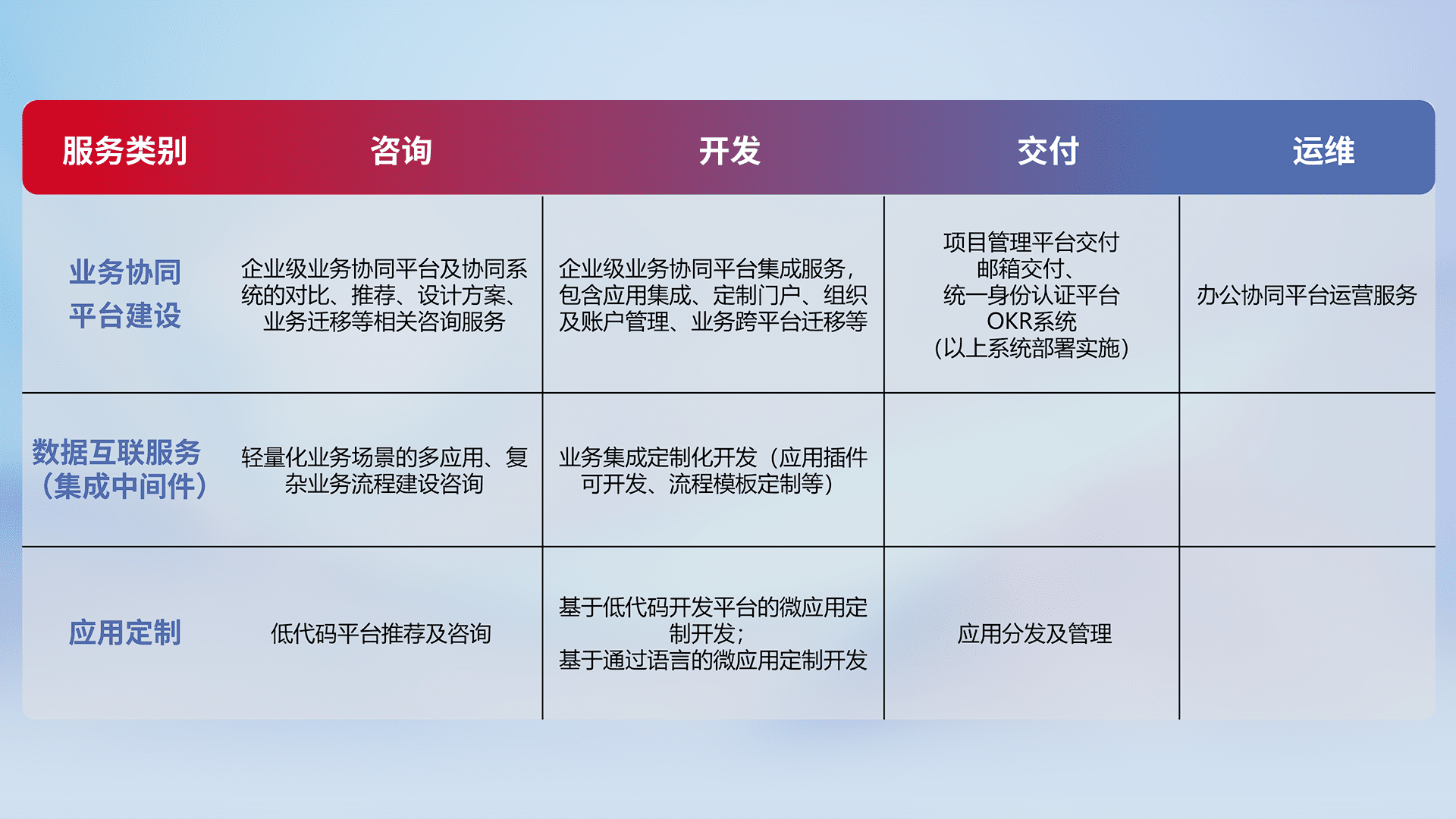 针对钉钉、、企微、、、、IDaas等平台级产品提供产品的规划、、、、方案、、、交付、、、定制化开发等服务,,,,实现如统一协同办公、、、智能客户服务、、混合会议管理、、、智能数据查询、、、等业务场景,,,实现数字化转型。。。。