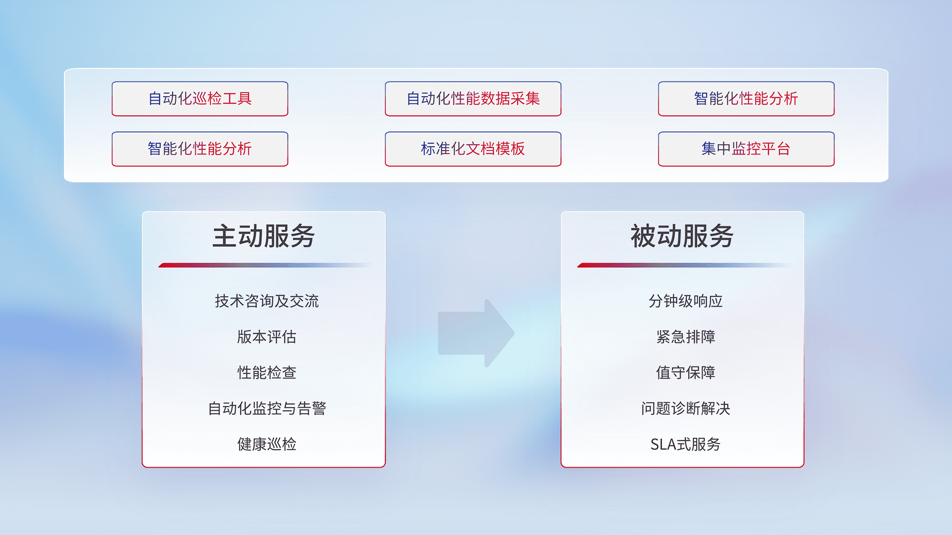 智能化工具和标准化文档,,,保障服务质量,,,,提供主动服务(包含技术咨询、、、、版本评估、、、、性能检查、、、自动化监控与告警、、、健康巡检)和被动服务包含(分钟级响应、、紧急排障、、、值守保障、、问题诊断解决、、、、SLA服务)。。。。