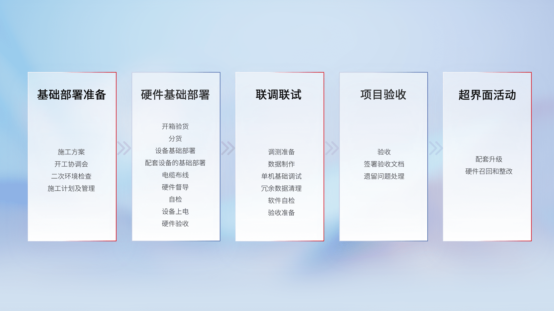 从基础部署准备、、、、硬件基础部署、、、、联调联试、、、项目验收、、越界面活动的全过程可追溯,,,保证施工质量和进度。。。。